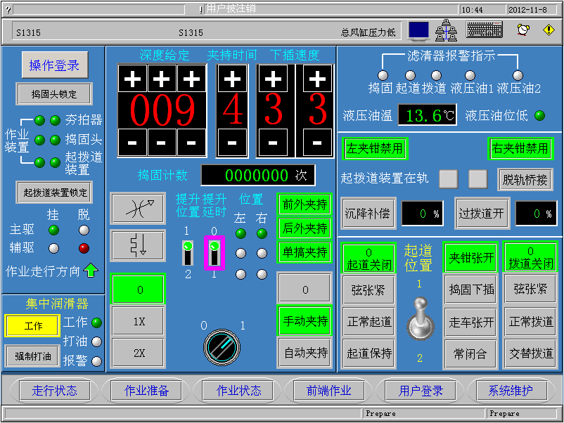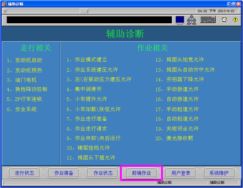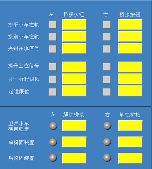 比如“前捣固装置”的锁定到位开关损坏,导致装置锁定到位后PLC没有收到锁定到位信号,在这种情况下,可将该信号桥接,使PLC系统正常产生所以设备锁定好信号。使大机顺利撤离作业现场 大机撤离作业现场到达站上后,再处理相应故障 |